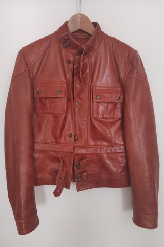 Chaqueta de cuero estilo cruzado (chupa), con un diseño de corte clásico. - Cierre principal con cremallera. - Bolsillos frontales con cremallera. - Cinturón ajustable en la parte inferior. - Puños con cremallera. - Curro de calidad El interior está para rehacer por completo, tiene un desgaste importante del uso que se le ha dado. Prenda vaig ntage auténtica. marca desconocida