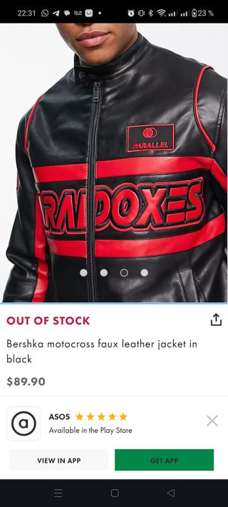 NUEVA SIN ESTRENAR PRECIO NO NEGOCIABLE Tallas: S, M, L y XL Bershka Cazadora racer (tipo cuero) con letras Paradoxes Parallel. Bezel GX-56-1BER Cazadora chupa chaqueta Bomber... efecto piel en color negro y detalles en rojo Bershka motocross faux leather jacket in black MORE PRODUCT DETAILS Jackets & Coats by Bershka Jacket upgrade: check High collar Zip fastening Regular fit. Polyester/Polyurethane/Polyester. Colour: red