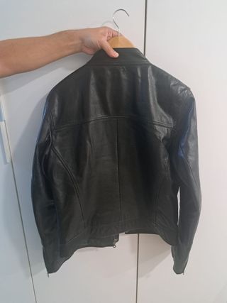 Cazadora de cuero estilo motero. Utilizada un par de veces, como nueva. - Diseño con cremalleras plateadas. - Cuello solapa. - Puños con cremallera. - Detalle de costuras en hombros.