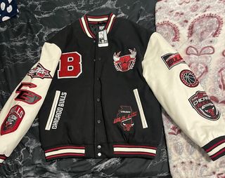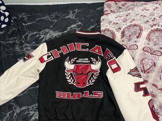 Chaqueta estilo varsity de los Chicago Bulls. - Diseño con parches y bordados. - Mangas de cuero sintético blanco. - Cuerpo principal en color negro. - Cuello, puños y cintura con detalles a rayas rojas y blancas.