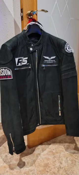 Chaqueta de cuero con un diseño inspirado en el estilo motero. Presenta parches y detalles que le dan un toque único. - Material: Cuero - Cierre de cremallera frontal - Bolsillos con cremallera - Puños con cremallera - Detalles de parches en la manga y el pecho -Nueva usada en una cena fue un regalo y me quedaba muy justa.