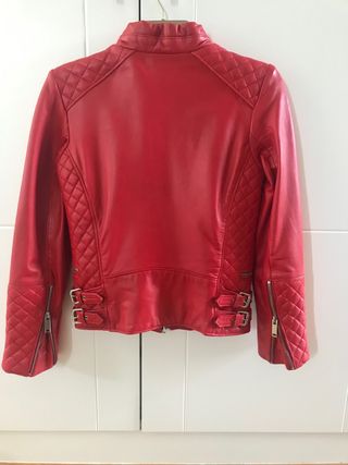 cazadora de cuero, color rojo, talla S, estilo moto.