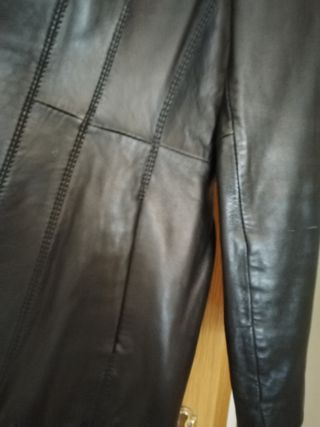 Chaqueta color negro tipo trenca con cierres de cuero. Muy buen estado.