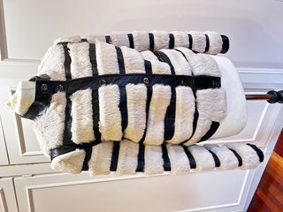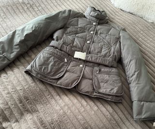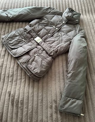 Chaqueta entallada de un color muy bonito gris topo de Carolina Herrera para Purificación García. Es super caliente y no pesa nada. El interior es 90% plumón de oca y 10% pluma. Capucha extraible oculta en el cuello con cremallera. Lleva cinturón ajustable con la vuelta en cuero. 4 bolsillos y 2 de ellos son dobles. Los detalles de los puños, coderas, botones y todo el diseño y calidad en general son excelentes. En la etiqueta interior va impresa la firma de Carolina Herrera. Talla S que da S/M. Expongo medidas en fotos. Coste de casi 500€. La he llevado en 3 ocasiones pero tieme las manchas de desteñido de otra prenda.