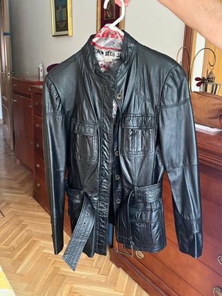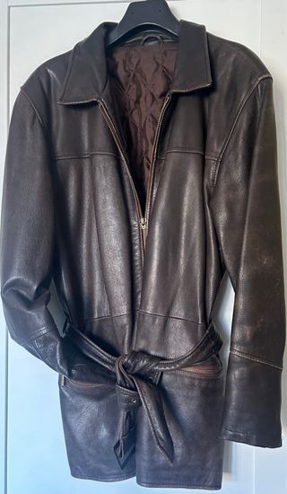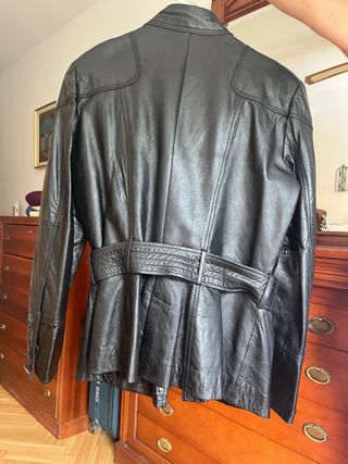 Auténtica chaqueta de cuero comprada en EEUU, California (San Diego). Gran calidad. Marca Aliza's. Talla 46 a 48. Unisex. Con cinturón y bolsillos laterales. Abriga bastante. Forro guateado. Muy buen estado. Sin usar apenas. Precio original 500$.