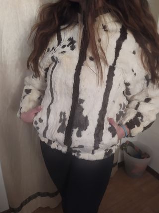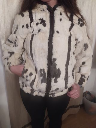 preciosa chaqueta tipo bombrer combiada de cuero y pelo de conejo , muy suave, bolsillos horizontales en frontal, puños y cintura engomados, cierre delanteri con botones automaticos