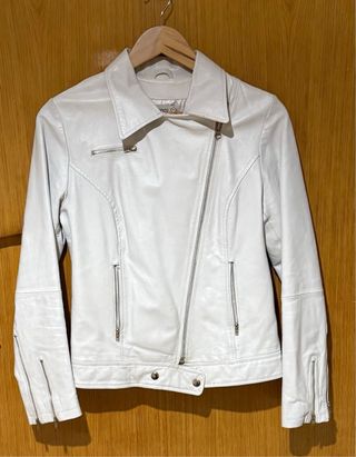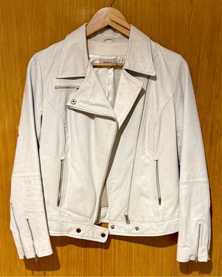 Preciosa chaqueta biker de cuero auténtico de la marca Bianco. Es de color blanco y talla M. Se encuentra en muy buen estado. - Diseño elegante y moderno. - Cremalleras funcionales. - Acabados impecables.