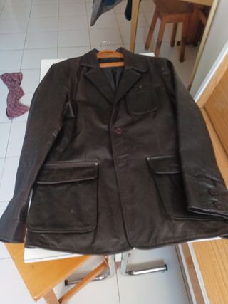 No respondo a ofertas. Chaqueta de cuero Salsa Jeans marrón oscuro talla M. Impoluta. Propietario no fumador. Colecciono cazadoras de cuero y esta es de 2014 aunque la vendo porque es de las que menos uso, así que no ha tenido uso continuado. Sin roces ni enganches. 5 bolsillos: 3 superiores (2 con cremallera uno con botón), 2 inferiores, 2 interiores. Pequeña tira de cuero con hebilla en el cuello. Costó 240 €. Axila a axila 45 cm Largura cuello a cintura por detrás 68 cm Manga desde hombro 66 cm Hombro a hombro 44 cm