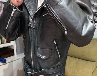 Chaqueta de cuero estilo motero. - Cierre frontal con cremallera. - Bolsillos con cremallera en el pecho y laterales. - Puños con cremallera. - Cinturón ajustable en la cintura. - Talla 42 - Piel auténtica - Clásico modelo lucido por Marlon Brando en la película Salvaje de 1953