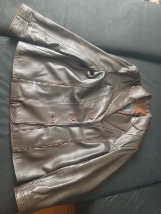 Elegante cazadora de cuero. - Material: Cuero. - Cierre de botones. - Bolsillos frontales. pone talla 44 pero es pequeña equivale a 36/38