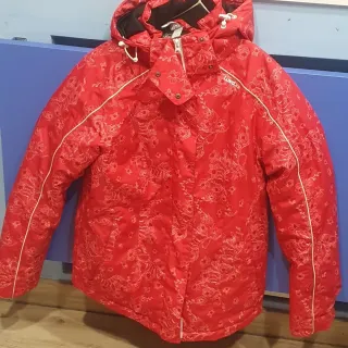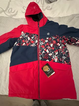 Chaqueta de esqui con un diseño llamativo y moderno de la marca Dare2b. Muy buena calidad. Nueva sin estrenar, con la etiqueta. Costo 110 libras. Muy fuerte y abrigada. Talla de 15/16 años que es entre 168 y 176cms de altura. Valido para chicas o para mujer. - Combinación de colores rojo y azul marino. - Panel central con estampado floral. - Capucha integrada. - Dos bolsillos frontales con solapa.