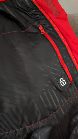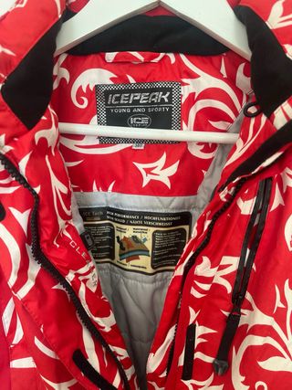 Chaqueta de esquí con un diseño moderno y llamativo. - Combinación de colores negro, rojo y blanco. - Cuello alto con forro interior. - Cremallera frontal. - Bolsillos con cremallera. A mi me queda estrecha pero bien, como entallada, y yo soy una clásica M.