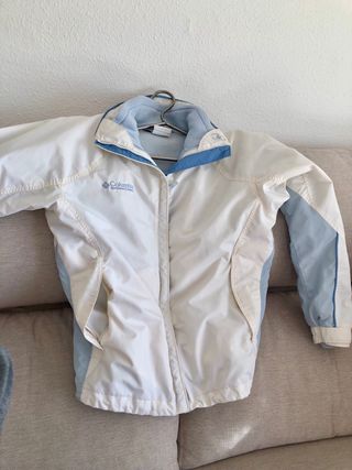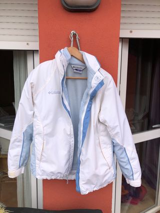 Chaqueta Columbia diseñada para actividad deportiva y esquí, práctica y funcional. Cuenta con exterior resistente y forro interior tipo polar, que aporta abrigo y comodidad durante el uso en climas fríos. Dispone de cierre frontal con cremallera, cuello alto para mayor protección y ajuste cómodo que permite libertad de movimiento. Los detalles en tonos azul claro y blanco le dan un diseño limpio y deportivo. TALLA M pero ajustado