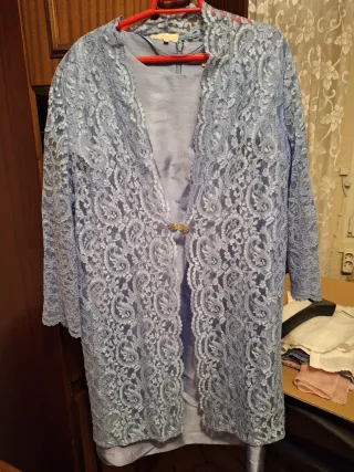 Conjunto de vestido de fiesta para mujer. - Chaqueta azul. - Cuerpo interior con detalles de encaje. - Cierre con botones.