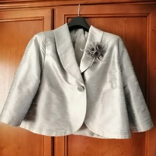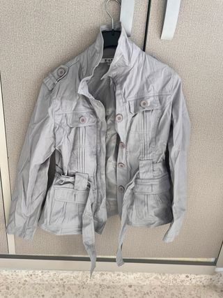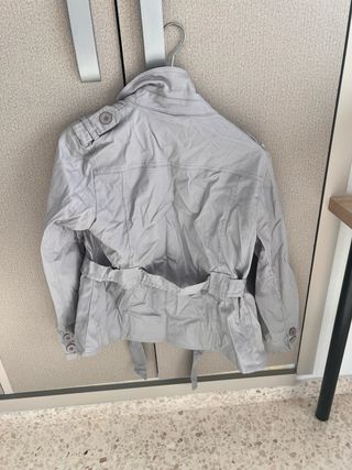 Elegante chaqueta o gabardina en color gris, ideal para eventos especiales como bodas o fiestas. - Diseño con cuello llamativo. - Cierre de botones. - Mangas con detalle y acolchadas y 3/4. - Corte favorecedor. Falta un botón delante (ver imágenes). Poco usada. Talla XL Tejido pone en la etiqueta "58% co, 38% pl y 4% sp".