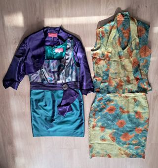 Dos conjuntos de fiesta de dos piezas cada uno. - Conjunto 1: Vestido con chaqueta, casa Renata. Talla 46. - Conjunto 2: Top y falda. Talla 44. - Tejido satinado y estampado.