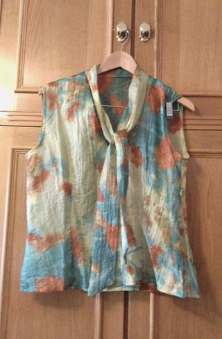 Conjunto de 3 piezas compuesto de: chaqueta, camisa de manga sisa y falda, ideal para eventos especiales. - Chaqueta con estampado de rayas horizontales en tonos azules, verdes y beige con cierre de botones en la chaqueta. - Camisa sisa color pavo real - Falda larga de satén en color pavo real En la camisa sisa pone talla 44 y en las otras dos prendas no pone talla, pero serán entre 44-46. La marca que he puesto Otre ha sido una al azar, puesto que no recuerdo de donde era.