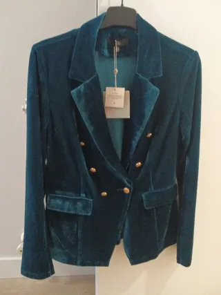 Elegante chaqueta de terciopelo con un llamativo diseño de doble botonadura. Ideal para estás fiestas. - Material: Terciopelo suave. - Color: Teal. - Cierre: Doble botonadura con botones dorados. - Bolsillos: Dos bolsillos frontales con solapa. Es finita