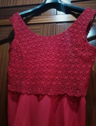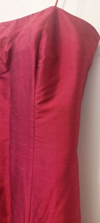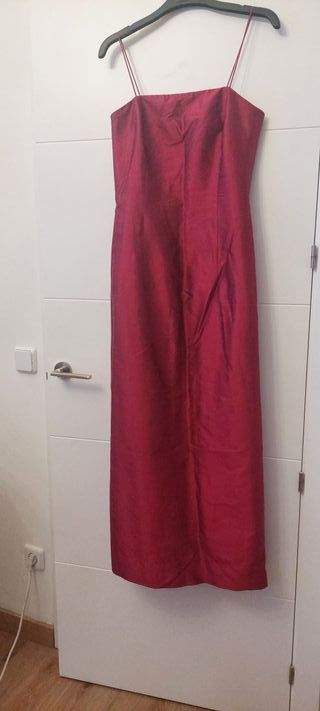 Elegante vestido largo de fiesta en un precioso tono rojo vino, en la foto sale rojo, pero es un rojo más oscuro, tono cerza. Es de seda salvaje. En mi perfil está tb la chaqueta q va a juego,cada pieza se vende por separado o el conjunto entero en 110 euros - Tirantes finos. - Diseño recto. - Tejido satinado.