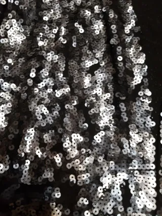Falda de lentejuelas negra, ideal para eventos especiales. - Diseño con lentejuelas brillantes. Con forro interior - Color negro y plateado. - chaqueta: 70 cm largo, 52 cm ancho y 53 cm manga - falda: 65 cm largo, 46 cm ancho. La cintura es elástica.