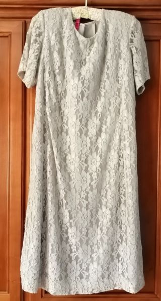 Elegante vestido de fiesta con un delicado encaje. - Diseño de dos piezas: vestido y chaqueta. - Detalles de encaje floral. - Cierre de cremallera en el vestido.
