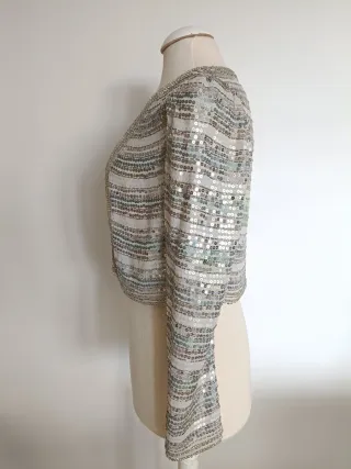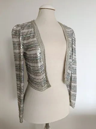 Elegante chaqueta de fiesta cubierta de lentejuelas que aportan un brillo especial. - Diseño abierto. - Manga larga. Sin ningún solo defecto. El exito está asegurado en una noche especial