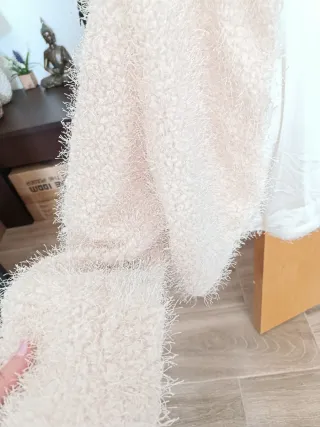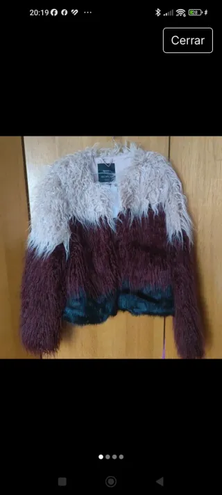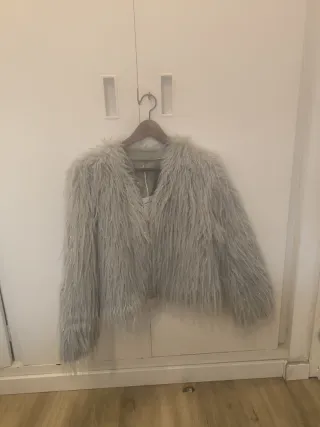 Chaqueta corta de fiesta con un tacto muy suave y peludo. - Diseño cropped. - Manga larga. - Abertura delantera. - Forro interior satinado. Usado solo una vez. Es cortita. No pone talla pero es una S. Cualquier cosa preguntadme. Respondo rápido!! 🎁