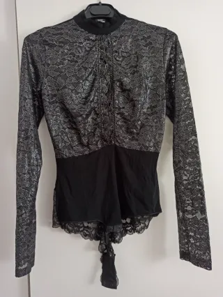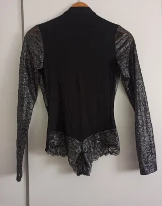 Elegante body de fiesta con un diseño de encaje. - Cuerpo superior de encaje con detalles plateados.Y abertura delanteta - Parte inferior de tela negra. - Adorno de encaje en el bajo.Medidas de hombros 36 y de largo 63 y de mangas 62.( la chaqueta No va incluida, es sólo orientativa)