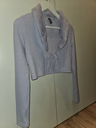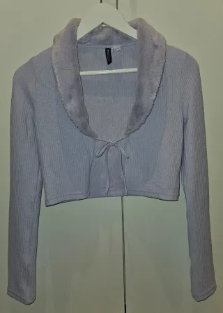 Torera corta de punto en color lila, con un suave cuello de pelo sintético que le da un toque de glamour. Ideal para darle un toque festivo a tu outfit. - Diseño cropped. - Cierre con lazada. - Manga larga. - Usado una vez para una fiesta. Conserva las etiquetas interiores y las lazadas para colgarlo. - Marca Divided H&M - Composición: 96% piliester y 4% elastano - Ancho de hombros: 38 cm entre costuras. - Largo de la pieza: 37 cm aprox., con el extra del cuello son 4,5 cm más - Largo de mangas: 62 cm aprox. - Talla S, pero es una S grande que puede valer como M.