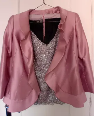 Elegante conjunto de chaqueta y top para ocasiones especiales. - Chaqueta en tono rosa empolvado con detalles de encaje floral. - Top a juego con delicado bordado. - Adorno floral