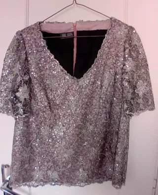 Bolero o chaleco de fiesta con un bonito brillo plateado y detalles de lentejuelas. - Tejido de hilo plateado. - Adornado con lentejuelas. - Diseño anudado en la parte delantera. - Mangas cortas abullonadas. - Nuevo con etiqueta.