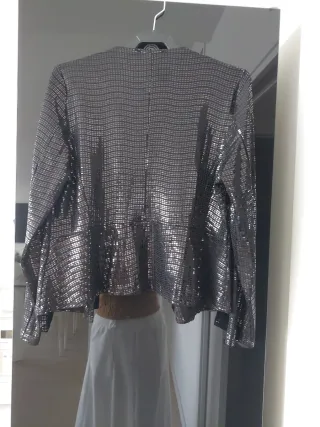 Elegante chaqueta de fiesta con un diseño brillante y moderno. Perfecta para complementar tu atuendo en ocasiones especiales. - Tejido metalizado plateado. - Diseño abierto. - Acabado brillante.