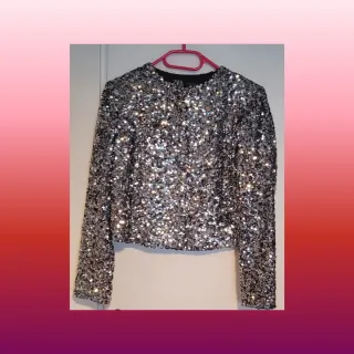 Chaqueta corta de ZARA con lentejuelas brillantes, ideal para ocasiones especiales. Sienta bien en los hombros, ya que tiene unas pequeñas hombreras. Llega hasta la cintura. Forrada y en perfecto estado. Solo 1 puesta. - Diseño de manga larga. - Acabado con lentejuelas plateadas y negras.