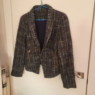 Elegante chaqueta de la marca Zara ideal para estás fiestas - Diseño clásico con un botón. - Dos bolsillos frontales están cosidos aunque se pueden descoser y utilizarlos, con solapa. - Forro interior. Solo se ha utilizado una vez, lo único que haría falta sería plancharla. Es una L pero equivale como una M