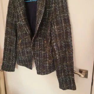 Elegante chaqueta de tweed con un diseño vibrante y moderno. Tiene un poco de brillos - Tejido texturizado con hilos de varios colores. - Cierre frontal. De fiestas también de diario - Bolsillos con cremallera dorada. Se recoge en benimaclet Si compráis más cosas hago precio