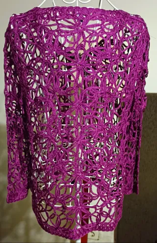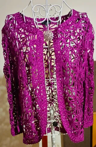 Chaqueta de fiesta en color fucsia con un diseño de encaje intrincado. - Tejido de encaje con motivos florales. - Manga larga. - Diseño abierto sin cierre. Incluyo broche de regalo. - 100% viscosa