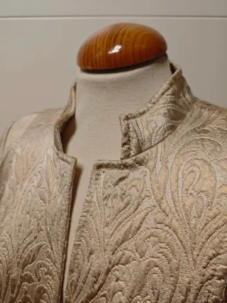 Elegante chaqueta larga con un diseño llamativo. para tallas , 36/44 amplia - Cuello asimétrico con detalle brillante. - Adorno floral dorado en la parte delantera. - Cierre con un botón decorativo.