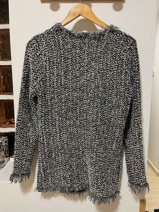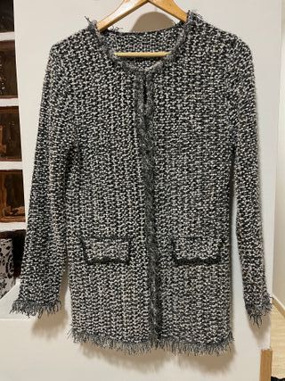 Chaqueta de fiesta, de punto talla M, hombros 40, sisa 46 y largo 70 cm, perfecto estado - Tejido texturizado en blanco y negro. - Acabado con flecos en cuello y puños.