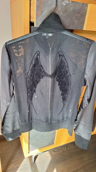Chaqueta de fiesta con diseño de alas en la espalda. - Tejido de malla transparente. - Detalle de estampado ornamental. - Cremallera central. - Puños y cintura elásticos.