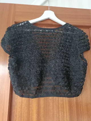 Elegante chaqueta corta, ideal para ocasiones especiales. Su diseño moderno y favorecedor la convierte en un complemento perfecto. - Corte moderno. - Mangas cortas - Solo un uso