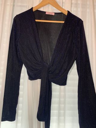chaqueta corta con lazo. De color azul oscuro y brillante. Tela fluida. Perfecta para una noche o un evento especial