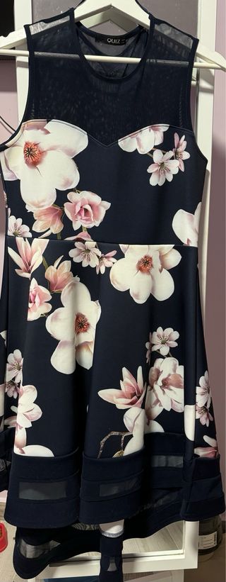 Precioso vestido de fiesta con chaqueta a juego. Puesto solo una vez. Queda genial y tiene bolsillos. El vuelo de la parte de abajo queda desde la cadera haciendo más forma en la cintura. Si necesitas medidas solo tienes que pedirlas.