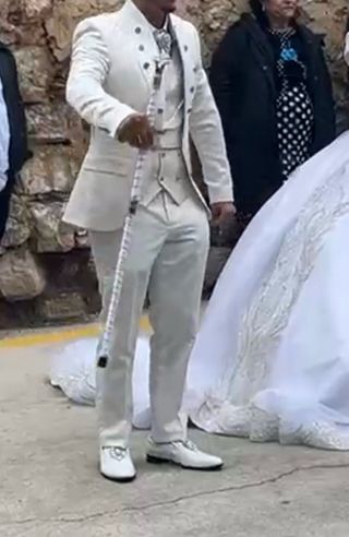 Traje de novio beige y dorado