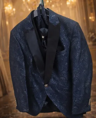 Elegante traje de novio en tono azul, perfecto para ocasiones especiales. Incluye un chaleco con un diseño llamativo. - Chaqueta con solapa de muesca. - Chaleco con estampado paisley. - Bolsillos frontales en la chaqueta. - Forro interior azul. Regalo camisa a conjunto
