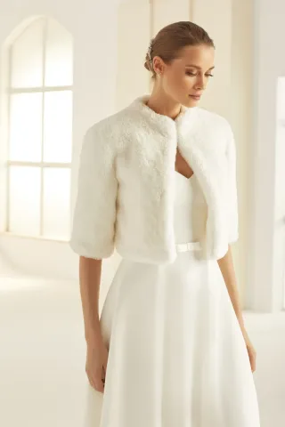 Elegante chaqueta de pelo sintético, ideal para complementar un atuendo de novia o de fiesta. - Diseño abierto con botón de cierre en el cuello - Tacto suave y cálido. - Acabado con líneas horizontales. - Forrada en todo su interior incluido mangas.