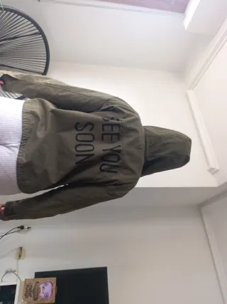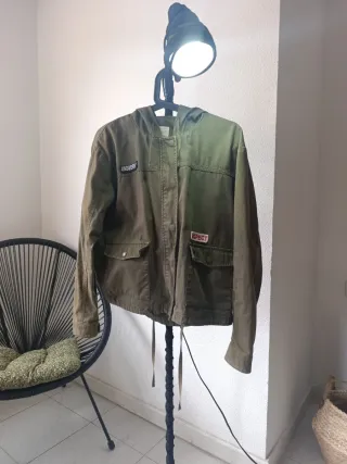 Chaqueta de estilo militar en color verde oscuro, con capucha. PRECIO NEGOCIABLE!!!! - Cierre de botones a presión. - Dos bolsillos delanteros con solapa. - Detalle de parches con texto. - Cordón ajustable en la cintura. -Comprarlo porfavor, que es la favorita de mi novia y llora con solo verlo.