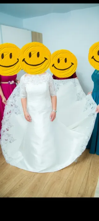 Elegante vestido de novia con un diseño clásico y favorecedor. Se da sin limpiar si eres de Pamplona lo dejo probar Ideal delgaditas Fechas marzo a junio Se le puede añadir chaquetas - Corte imperio que realza la figura. - Mangas cortas de encaje. - Cinturón decorativo con detalles. - Falda con varias capas y cola.