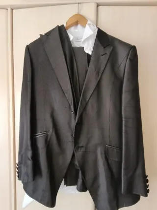 Vendo traje de novio de alta costura de Inmaculada García, usado una sola vez. En perfecto estado, como nuevo. Incluye: • Chaqueta (talla 50-52) • Pantalón (talla 44) • Chaleco a juego Características: • Color: gris plata • Tejido: seda salvaje • Tejido fresco, ligero y muy cómodo • Corte elegante y favorecedor Ideal para bodas, eventos formales o sesiones de fotos. Traje exclusivo de diseñador, difícil de encontrar. Se puede ver y probar sin compromiso. Precio negociable razonable.