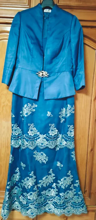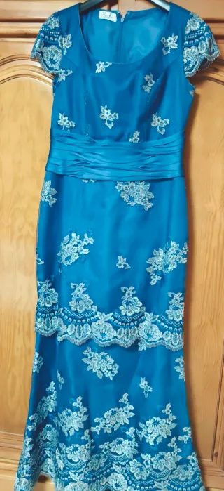 Elegante conjunto de dos piezas para madrina. Vestido azul de madrina bordado en hilo de plata con flores de la marca Higar novias. Lleva la chaqueta a juego con broche. Talla de pecho para una 95(90cm medidos),103 cm cadera,78 cm de cintura. Para una altura de 1'58cm el largo desde el final del cuello por detras hasta abajo es de 1'44cm. Solo tiene una puesta.