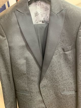 Elegante traje de novio en color gris, perfecto para una ocasión especial. Incluye chaleco y pañuelo a juego. Chaqueta 46, pantalon 38, chaleco 48. Para 1,72 de altura perfecto. - Chaqueta con solapa de muesca. - Cierre de dos botones en la chaqueta. - Chaleco con estampado floral. - Pañuelo de bolsillo a juego.